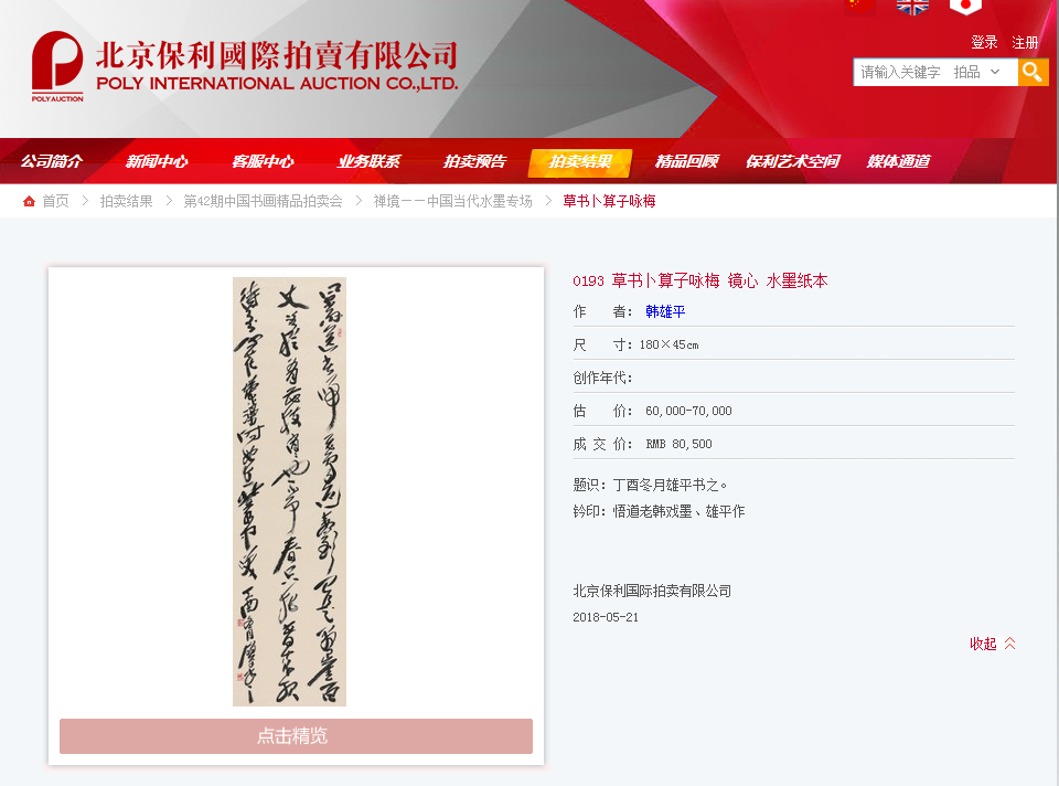 记者近日获悉北京保利第42届中国书画精品拍卖会——禅境当代中国水墨专场。中国著名书法篆刻家韩雄平先生(卜算子·咏梅)书法精品力作,以人民币8.05万元成交。打破了他本人继2016年翰海单幅作品人民币6.9万元成交纪录。