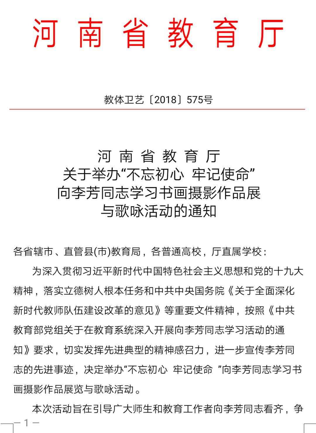 日前从河南省教育厅获悉,按照《中共教育部党组关于在教育系统深入开展向李芳同志学习活动的通知》要求,切实发挥先进典型的精神感召力,进一步宣传李芳同志的先进事迹。河南省教育厅将在9月份举办“不忘初心 牢记使命 ”—向李芳同志学习书画摄影作品展,本次活动由河南省教育厅主办,郑州师范学院、信阳师范学院、河南省学校艺术教育协会、荆浩艺术研究院承办,现面向社会开始征稿。