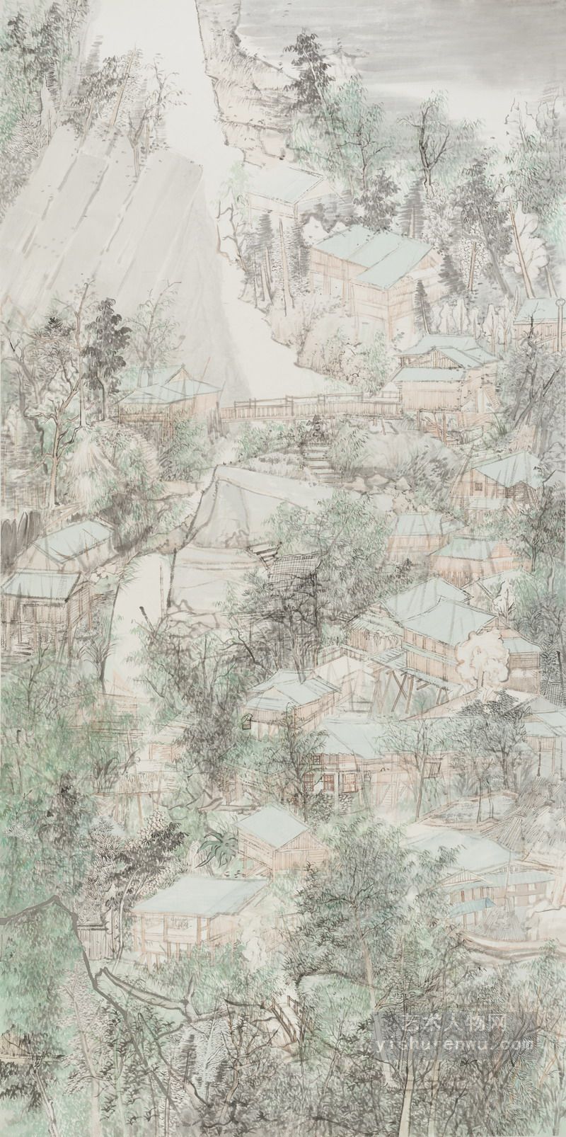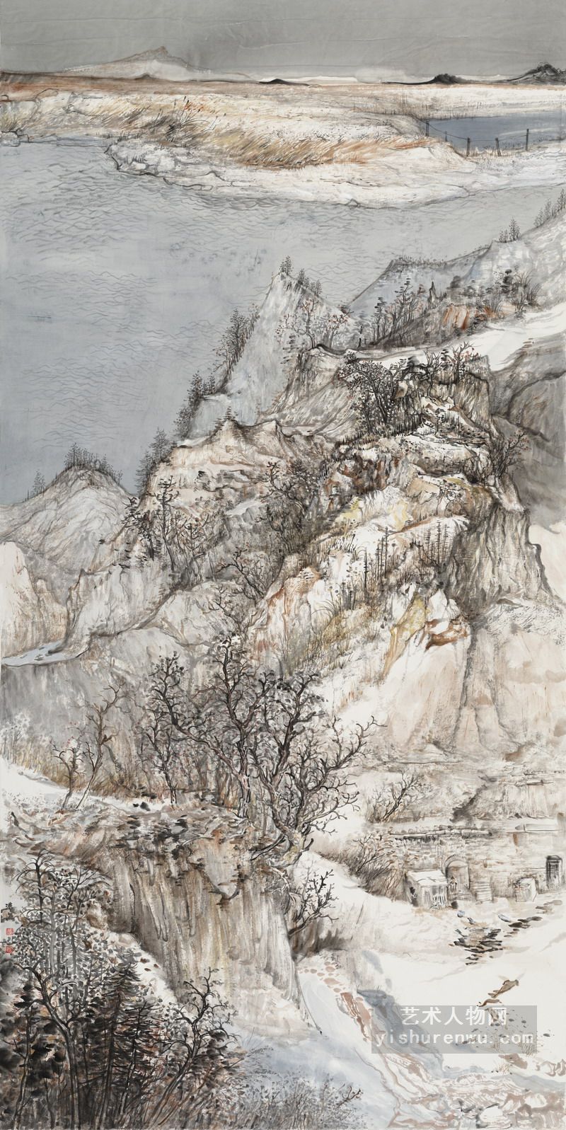 正是有了这些“取精用宏,澄怀味象”的涵养,形成了洪海绘画朴实内向,注重精神实质刻画的画风。他的画往往丘壑纵横,高屋建瓴,主峰突兀,气势磅礴。“大山堂堂为众山之主,所以分布以次冈阜林壑为远近大小之宗主也。其象若大君赫然当阳而百辟奔走朝会,无偃蹇背却之势也。”(郭思《林泉高致集》)他的画有北宋山水画的大场景,大开合,大气势。这种全景式的构图是历代山水画家所追求的,正如沈周有《庐山高图》,范宽的《雪景寒林图》,郭熙的《早春图》等,这种宏大的场景可能正是洪海心中的图像吧,亦或是他心胸的写照。
