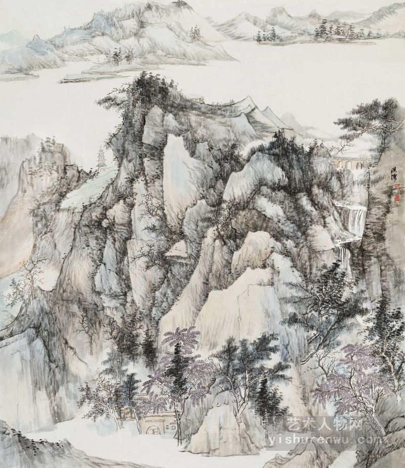 宗炳有云“聖人含道應物,賢者澄懐味像。”我想但凡画山水的人都有这种精神的向往吧,大家期望着自己能够和山川宇宙交流、对话、融合,从而达到天人合一的境界。于是“望秋云,神飞扬,临春风,思浩荡。虽有金石之乐,王圭璋之琛,岂能仿佛之哉!”(王微《叙画》)我想洪海之所以喜欢山水画,数十年如一日的坚持下来,正是基于这种精神的追求。“山川为我传神,我为山川写照”,于是就有了他那浓墨重彩,厚积薄发的笔底江山,一幅幅的佳作,呈现在我们面前,应接不暇,展现了一条他为了山水画艺术不倦探索,迎难而上的道路。他在这条道路上朝花夕拾,不断采撷着那一幅幅美不胜收的画卷。