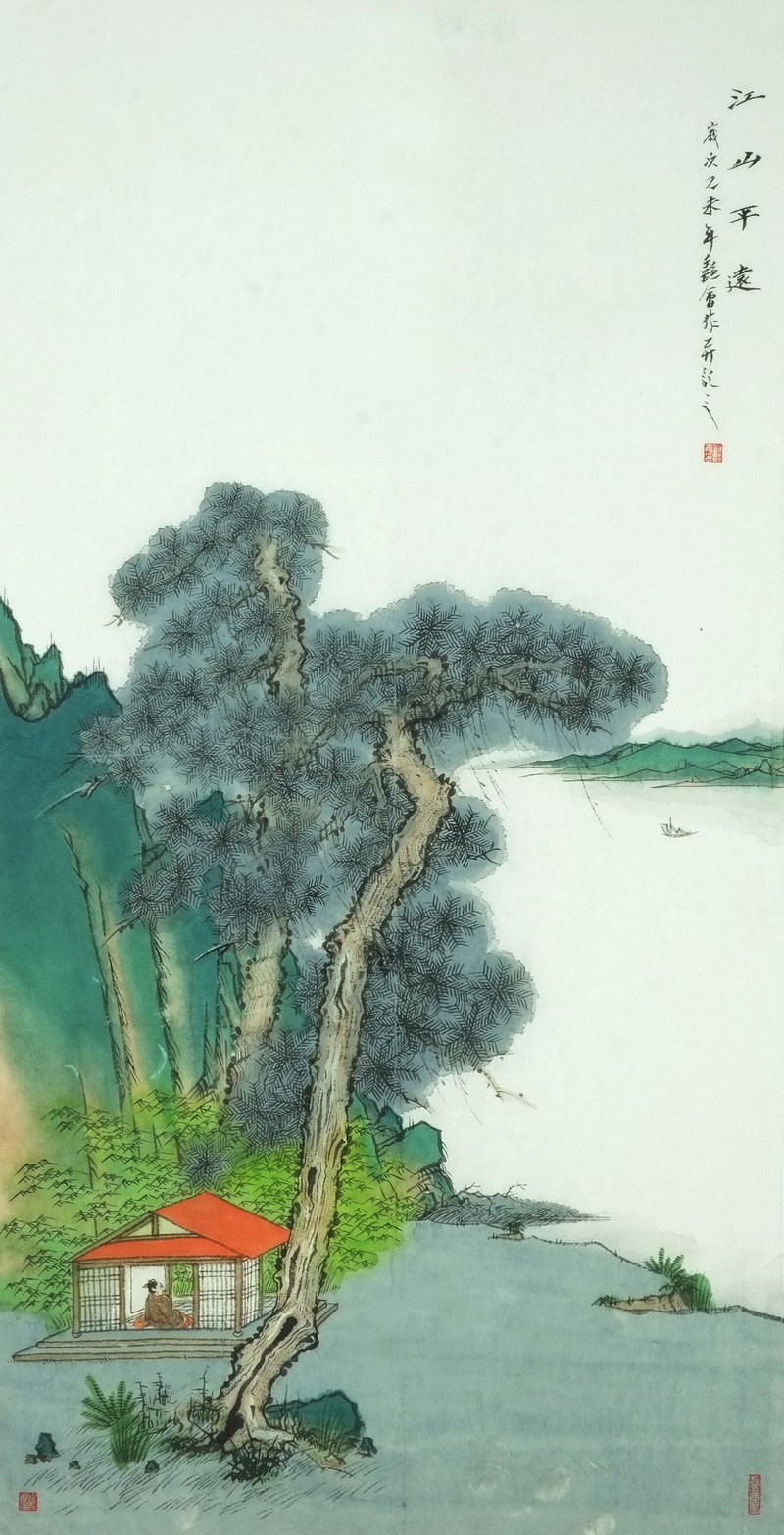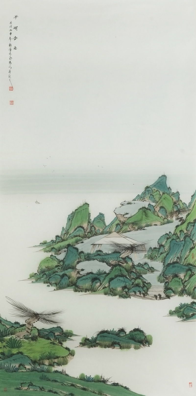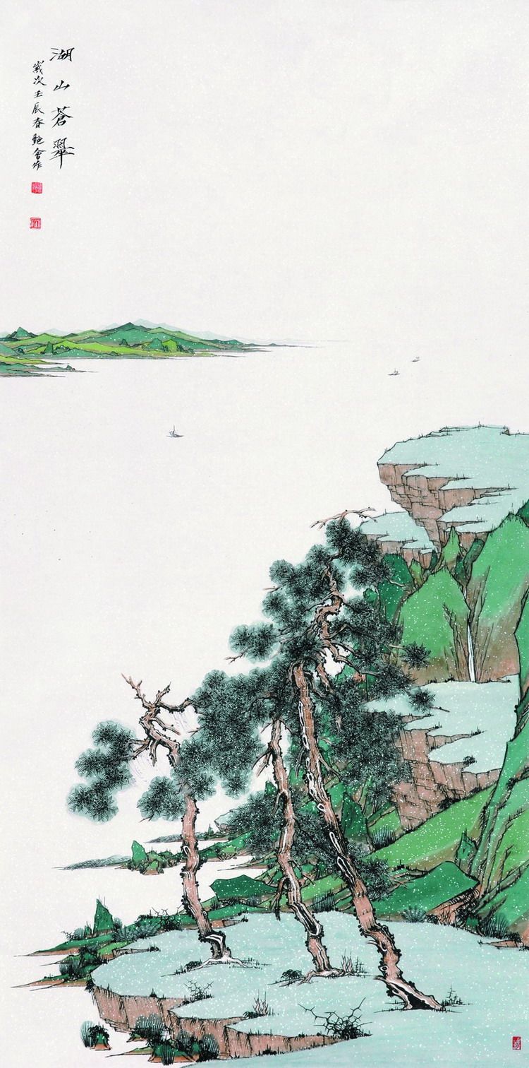 画面上大胆留白,天头地角异常开阔,整幅作品静穆幽远,这是刘艳会在精心探究历代青绿山水大家的经典之作后,融入个人思想而逐渐形成的山水特质。他从不避讳山水色调的清新清丽,始终遵循一种浅绿色的视觉色调,这既是他出于构图形式和心性释然的考虑亦是在他融入生存的理念后,主动将青绿山水提升为现实存在的艺术样式,从而传递给人们的唯美的审读感受——每位欣赏者在瞬间审视令自己深切感动的画面时,不由自主在心底累积成澄明清新的愉悦心性,如一幅清凉剂释怀着现实人们的压力和心绪。