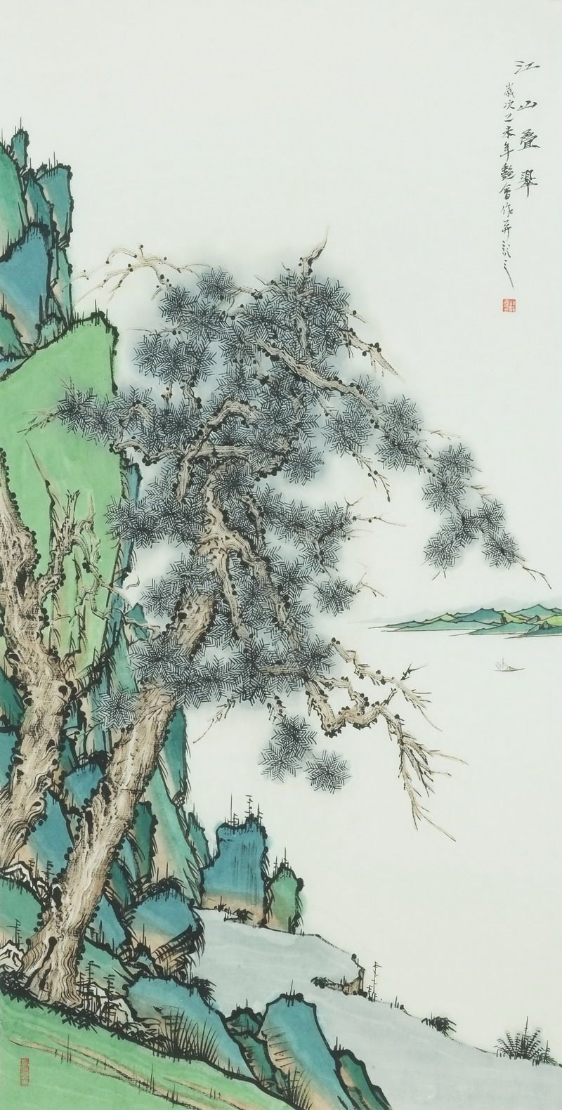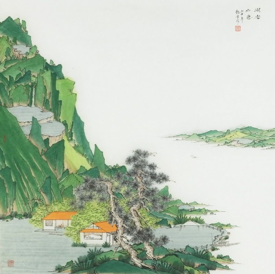 那是不由人不注目的弥漫着生命律动的青绿山水!清新典雅的意境融合着时代气息,意象超逸的画面透着超凡的才情。那简洁空灵的勾勒,那云光翠影的色彩,不由人不生出“充满意趣的精神旨归”的感慨。这是刘艳会的新青绿山水给人的深刻印象。